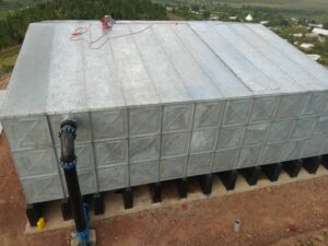 Before the installation of the 590m³ pressed steel tank, the community faced insufficient water supply. Borehole pumping alone was not capable to meet the water demand of the community.